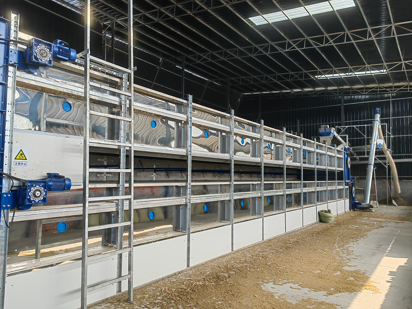 该设备主要利用鸡舍尾端排出热空气或室外空气经过高压风机来对湿鸡粪进行干燥, 并将鸡粪内的含水率降至20%左右 。